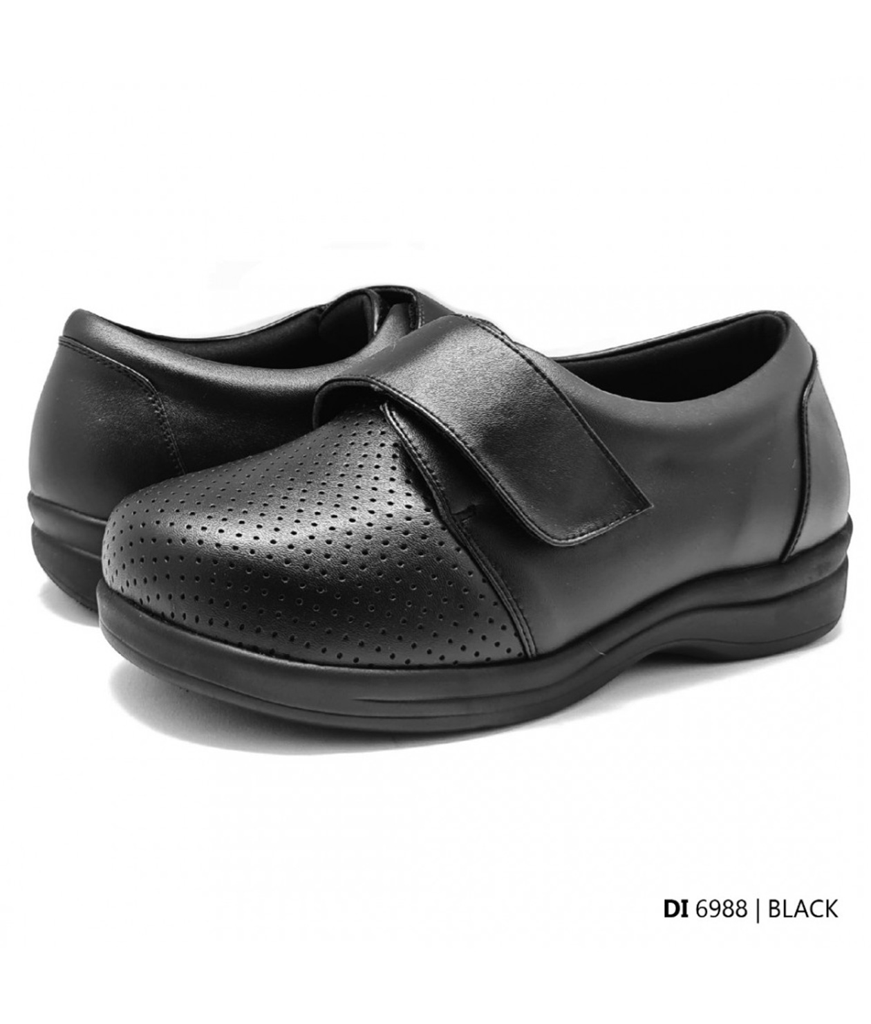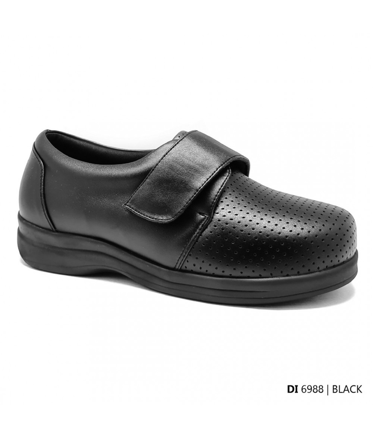 Diabetic shoes designed to provide protection and comfort for diabetic feet. These shoes are biomechanically engineered with shock absorption and even weight distribution to help prevent the formation of corns and calluses that can lead to foot ulcers. Features include a soft upper and a firm heel counter.