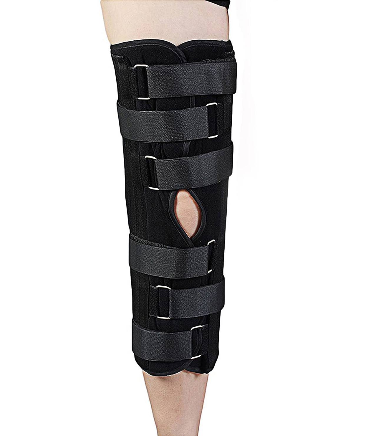 A leg immobilizer, commonly referred to as a knee immobilizer, is an orthotic support designed to maintain the knee in full extension and limit joint motion. By restricting knee flexion, it provides stabilization to injured soft tissues and osseous structures, thereby promoting optimal healing conditions. Leg immobilizers are typically constructed from lightweight yet rigid materials, such as padded foam combined with aluminum stays, to ensure effective immobilization while maintaining patient comfort.